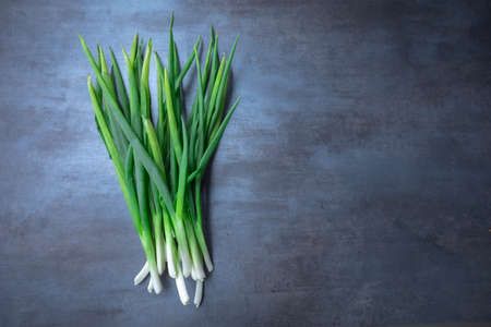 Green onions on a dark gray concrete background. Allium nutans onion. Top view, vertical orientation.