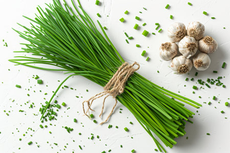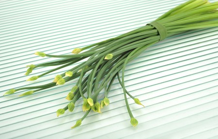 bunch of fresh chives on a table. studio shot