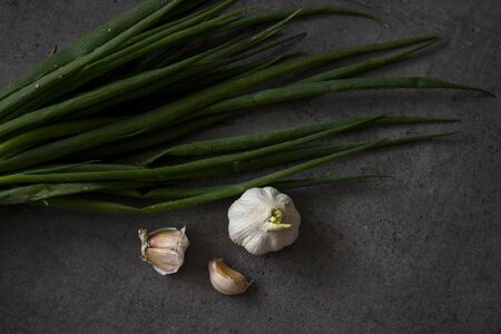 Garlic and green onion top view photo. Dark grey background.