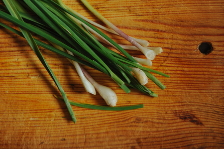 Green garlic on wooden cutting board