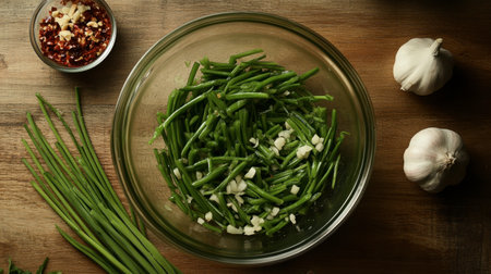 Garlic Chives on wood table background