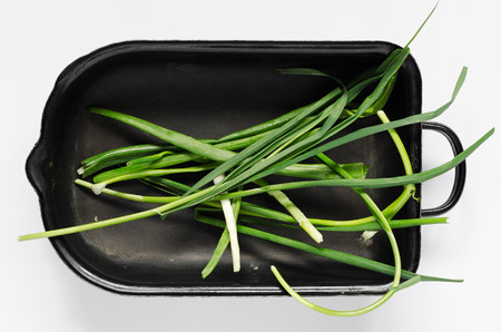 Scallions in the center on a black oven dish healthy ingredient raw food concept