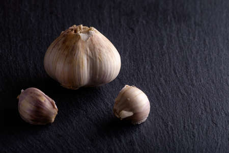 Close up three whole garlic bulbs isolated on black stone table background. Flat lay. Top view. Food photography concept.