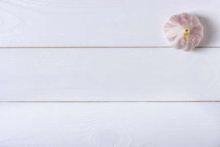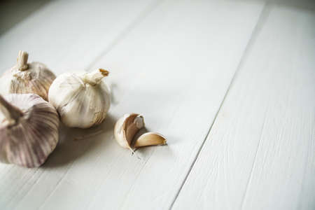 Garlic on white wooden background.
