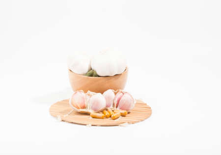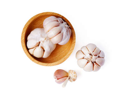 Fresh garlic in wood bowl, Raw garlic with segments close up isolated on a white background. clipping paths.