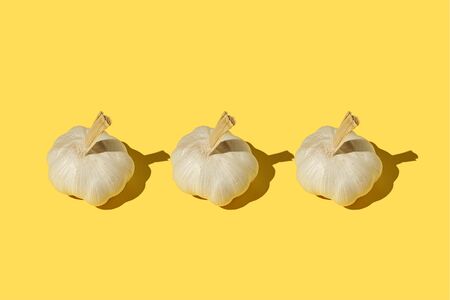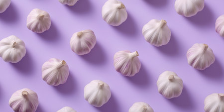 Garlic bulbs on a colored background, colorful garlic pattern. Panoramic banner.