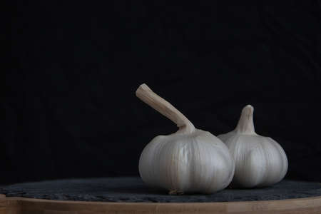 Two bulbs of garlic lie on a stone cutting board. close-up. daytime lighting. Black background. Place for text. copy-paste.