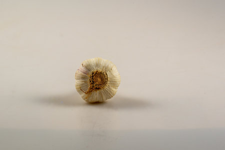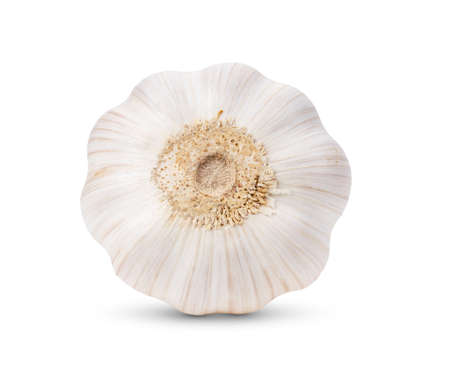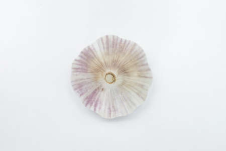 closeup of the underside of a garlic bulb against a white background