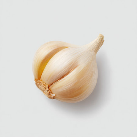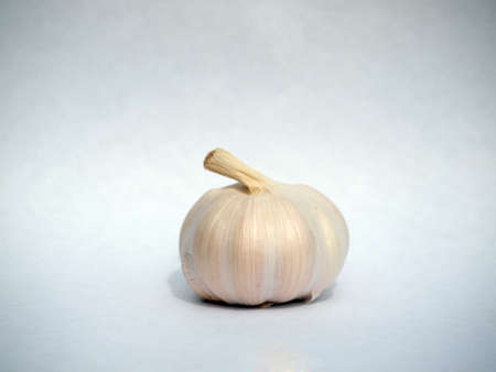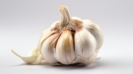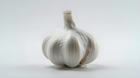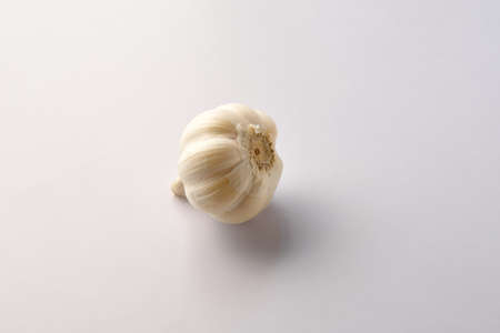 A white garlic head on a neutral background