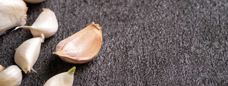 Close up of fresh garlic cloves on black table background.