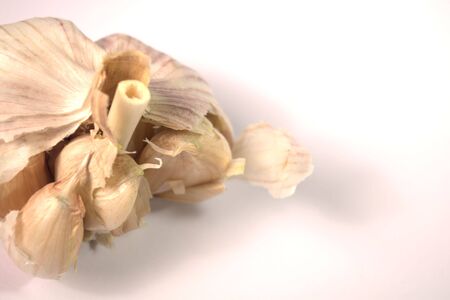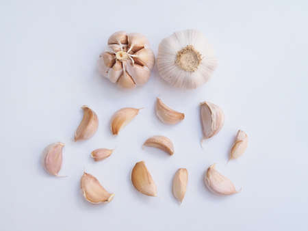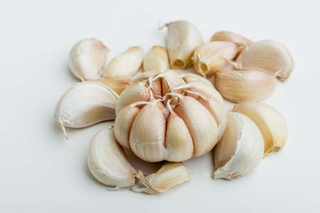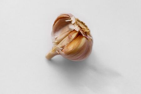 Broken garlic on a light white background. Food photography