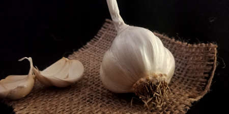 Fresh white single garlic sack mat surface set isolated on black background agriculture surface branding presentation.