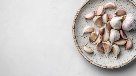 Fresh garlic cloves and bulbs on a round plate, top view with a white background and room for copy space