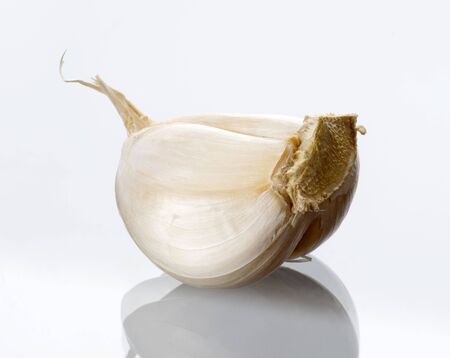 Close-up of garlic clove with a sprout on white background. Raw garlic with segments on white background.