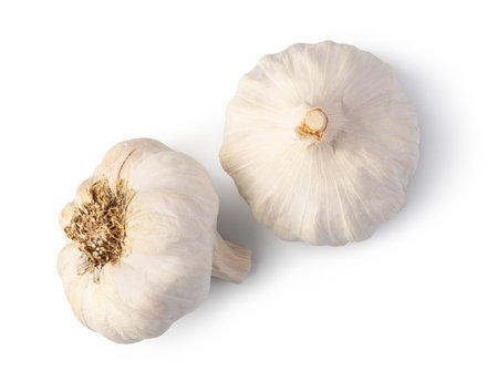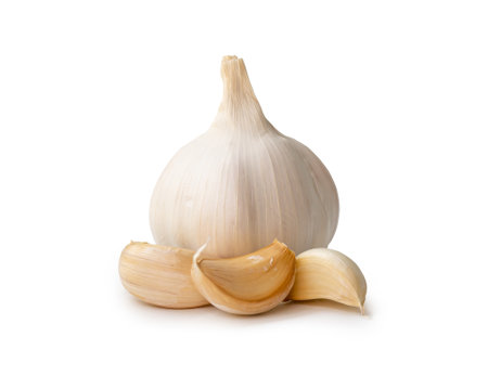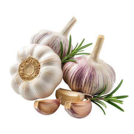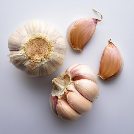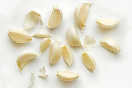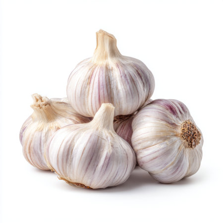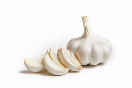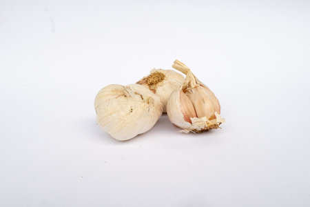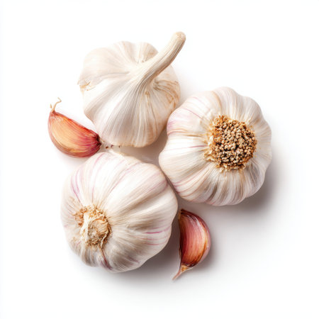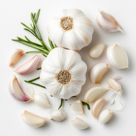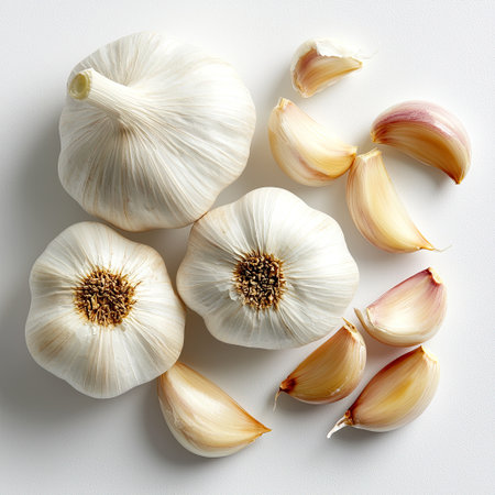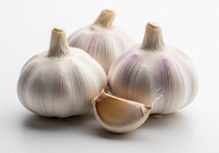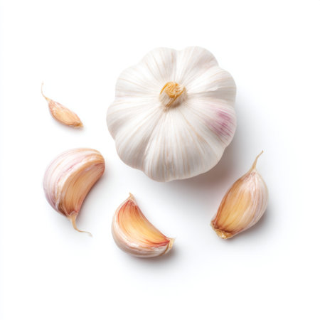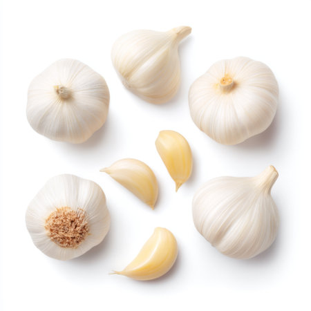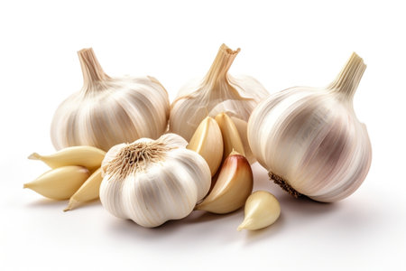 A visually appealing arrangement of fresh garlic bulbs and cloves on a clean white background, perfect for culinary arts, food photography, and healthy recipes.