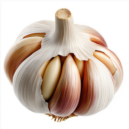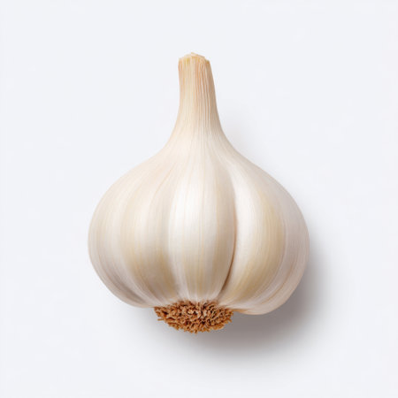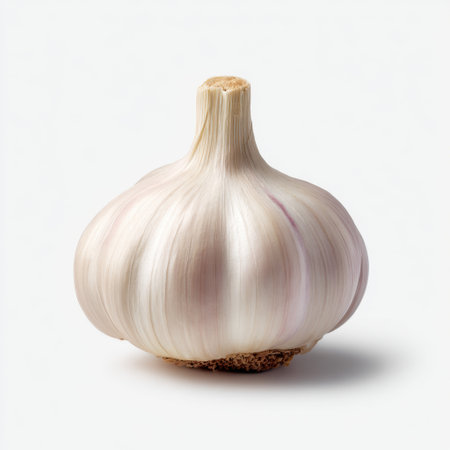 This image features a close-up view of a fresh garlic bulb set against a clean white background. Ideal for culinary themes, food blogs, and health-related content.