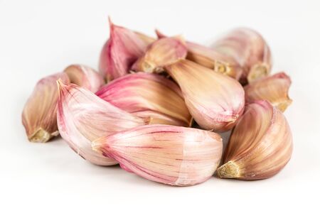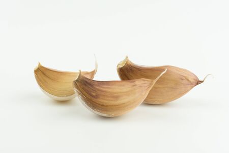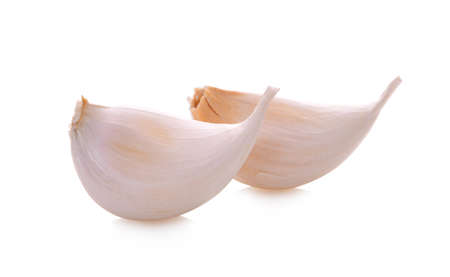 Close-up of garlic clove with a sprout on white background. Raw garlic with segments on white background.