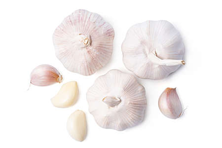 Garlic cloves and pieces of raw garlic on isolated white background. Top view Garlic bulbs.