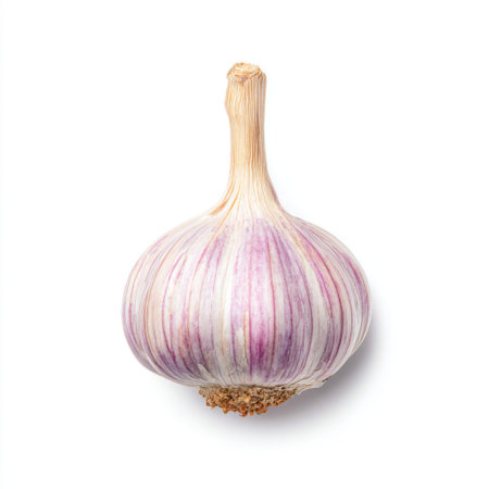 A whole fresh garlic bulb featuring striking purple and white stripes, ideal for culinary use, health benefits, and food photography. Perfect for various recipes.