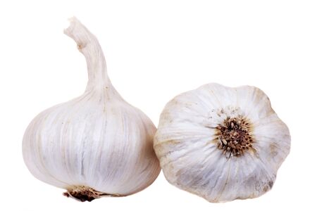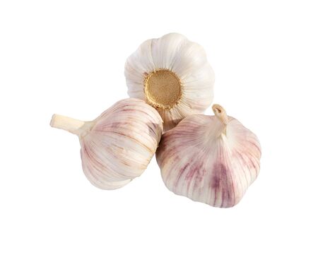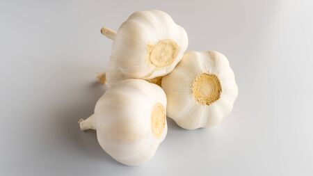 Garlic vegetable bulb on a white background. Allium sativum. Spicy garlic vegetable. Family of onions. Plant of the amaryllidaceae family. Garden plant. Vegetarian food. Spicy raw food.