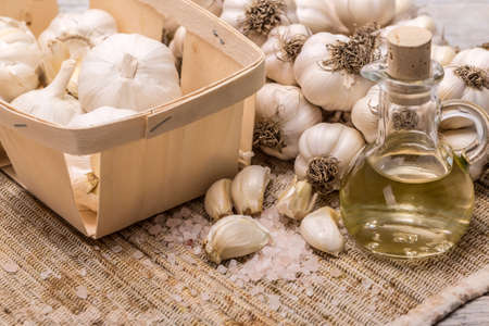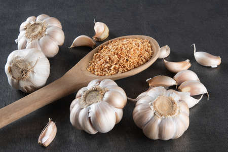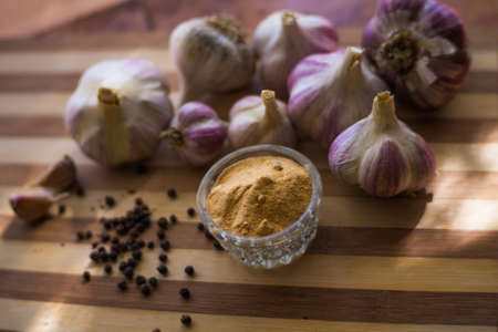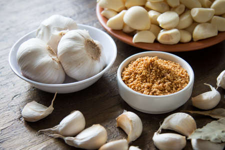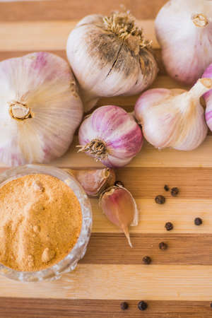 Delicious garlic bulbs and cloves with a spoonful of garlic powder on a wooden old table