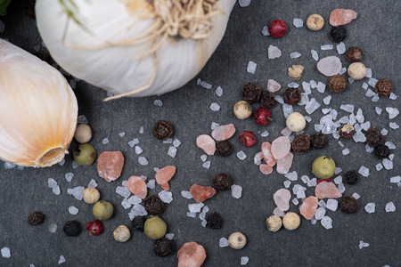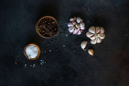 Fresh Organic Garlic, Coarse Sea Salt, Himalayan Pink Salt and Rainbow Peppercorns on dark background.