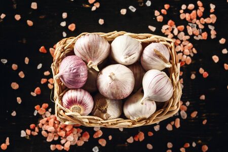 Garlic Close Up in a Basket with Pink Himalayan Salt on Dark Background. Top View, Selective Focus.