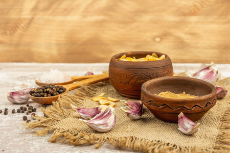 A visually appealing arrangement of fresh garlic bulbs and assorted spices on a rustic wooden table. Ideal for cooking enthusiasts and culinary presentations.