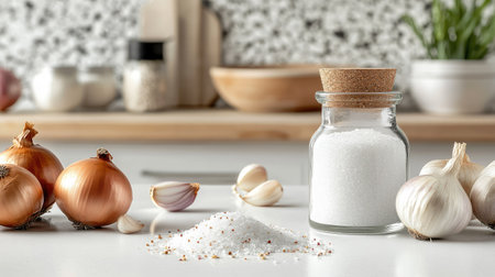 A rustic kitchen scene featuring onions, garlic, and a bottle of salt on a countertop. Perfect for cooking and food preparation themes in culinary photography.
