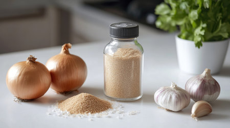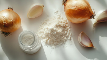 An elegant arrangement featuring onion powder, fresh garlic, and onions, highlighting culinary ingredients for flavorful cooking in a modern kitchen setting.