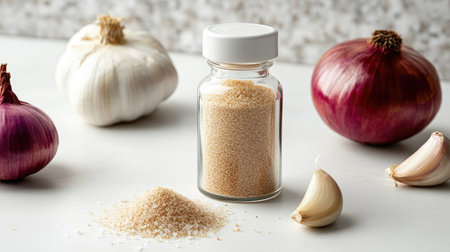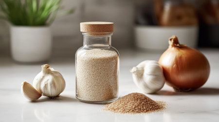 A close-up shot showcasing onion powder in a jar next to fresh onions and garlic cloves on a countertop, highlighting culinary ingredients.