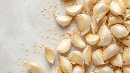 Fresh garlic bulb with peeled cloves and garlic powder scattered on a light surface, highlighting natural textures and culinary details for food enthusiasts