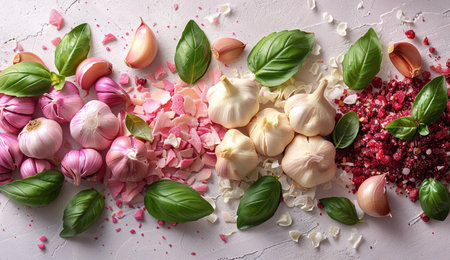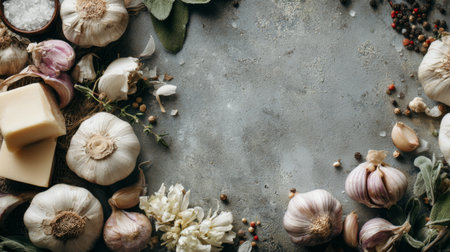A beautifully arranged flat lay of fresh garlic, herbs, and spices on a rustic grey surface, perfect for culinary inspiration and fresh recipe ideas.