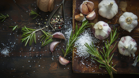 Close-up of garlic cloves and rosemary sprigs on a wooden board, highlighting fresh ingredients and rustic charm. Ideal for themes of cooking, natural ingredients, and rustic cuisine.