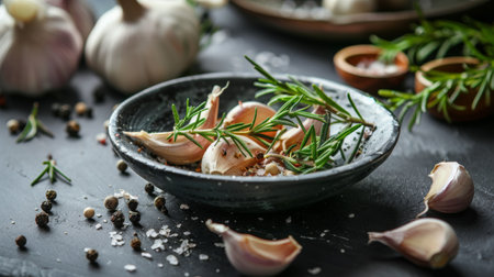 A ceramic bowl filled with garlic cloves and fresh rosemary, surrounded by spices and herbs on a dark surface, creating a rustic and aromatic cooking scene.