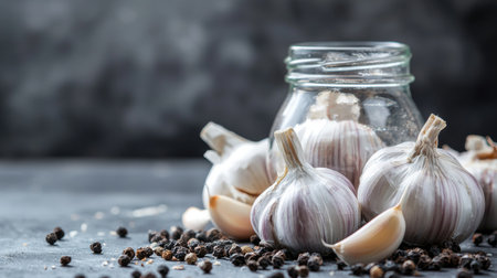 Close-up of fresh garlic bulbs and scattered peppercorns on a dark, rustic background, providing an aromatic and earthy culinary scene.