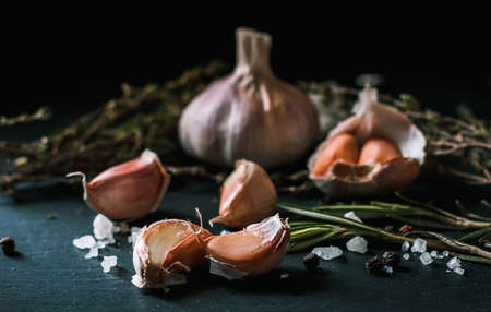 Food cooking background. Spices herbs and garlic at black slate table. Food ingredients top view.