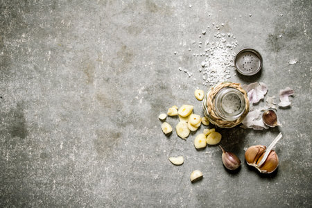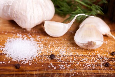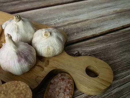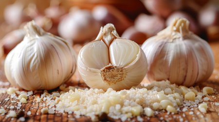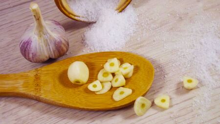 A beautiful arrangement of fresh garlic cloves and sea salt on a rustic wooden surface, perfect for food styling and culinary creativity.