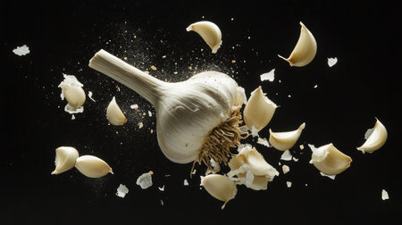 This striking image captures a fresh garlic bulb with cloves bursting against a dark background, highlighting its natural textures and culinary appeal.