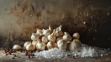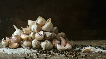 A pile of garlic bulbs and peeled cloves, arranged in a rustic setting, with coarse sea salt and peppercorns around, creating a natural, earthy composition.