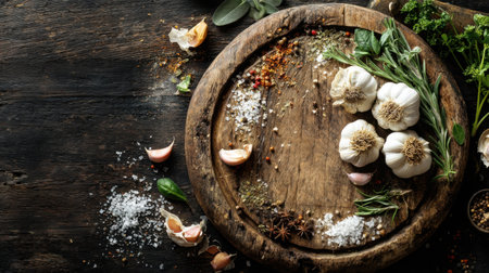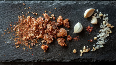 An artistic arrangement of fresh spices, garlic, and sea salt on a stylish slate board, perfect for culinary enthusiasts seeking inspiration in the kitchen.