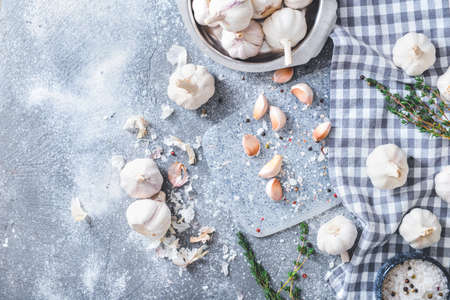Whole heads and cloves of garlic lie on a metal dish on a gray background. Top view, close-up.