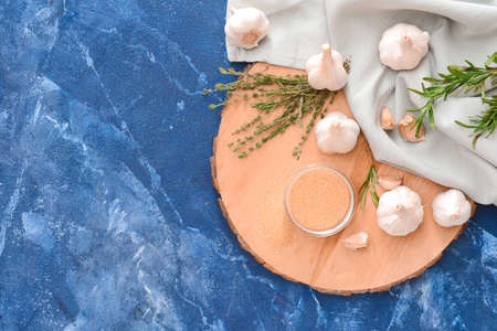 Garlic spice for recipes. Spoon and a pile of garlic powder. Garlic head and cloves on the table.