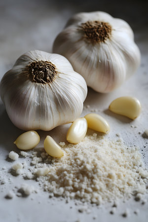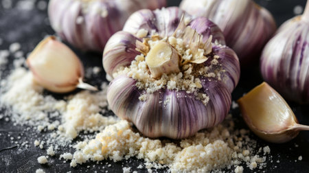 Close-up of fresh garlic cloves combined with garlic powder, perfect for culinary creations. Ideal for food photography and cooking inspiration.