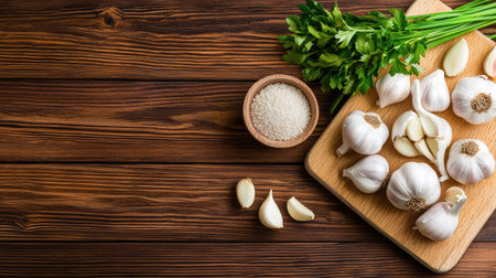 A vibrant display of fresh garlic bulbs, peeled cloves, and green parsley on a wooden cutting board, accompanied by sea salt. Perfect for culinary inspiration.