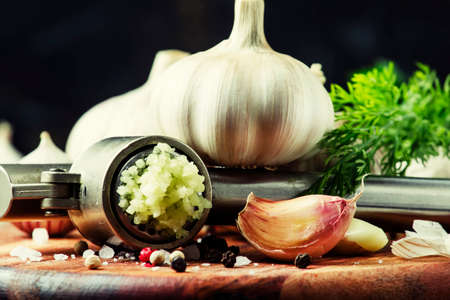 Fresh garlic, squeezed through the press, spices, herbs and salt, selective focus