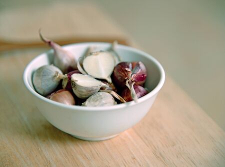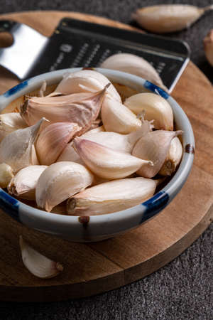 Garlic in a wooden bowl is ready to cook in the kitchen.