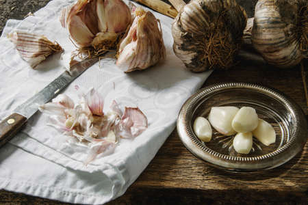 Garlic on kitchen table. Healthy ingredients for food. Traditional flu treatment. Garlic when preparing food. Spices against flu.