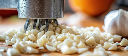 A close-up of a garlic crusher pressing fresh garlic onto a cutting board. . --ar 16:7 --v 6.1 Job ID: 80452488-6385-42e1-aa61-112a340b2825