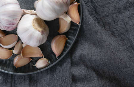 Whole heads and cloves of garlic lie on a metal dish on a gray background. Top view, close-up.